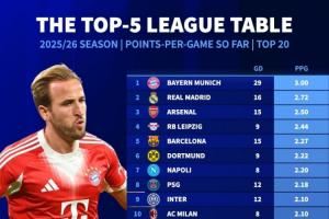 2025/26赛季五大联赛球队场均积分榜:
