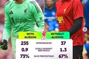 由于阿利森受伤,玛玛达什维利很可能在本场临危受命。英超官方也盘点了阿利森此前登场与否对于利物浦的影响,具体如下: